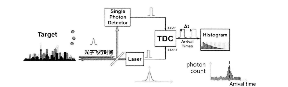 基于单光子探测器 (single-photon detector,SPD)的时间相关单光子计数技术(Time-Correlated Single-Photon Counting,TCSPC)可以有效探测激光雷达微弱回波信号的时间信息。TCSPC的原理如图所示,激光雷达向目标发射高重复频率的脉冲激光,测量后向漫反射光子的飞行时间信息,然后将若干个周期探测到的离散信号累积成直方图,便可以还原微弱光信号的波形。在利用单光子计数技术(TCSPC)的三维成像激光雷达,可将传统激光雷达的成像距离提高到了10 km左右。