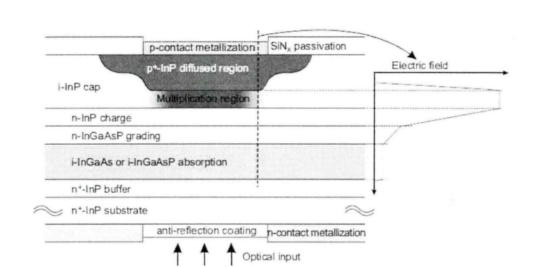 在多模激光雷达系统对云层的测量中,1.5 μm激光因其较高的大气透过率和较低的天空背景辐射而适合远距离探测,但同时也导致其后向散射回波信号极其微弱。为此,系统采用了基于InGaAs(铟镓砷)材料的单光子雪崩二极管(NFAD)。InGaAs是一种III-V族化合物半导体,其核心优势在于可通过调节铟(In)和镓(Ga)的比例来精确“裁剪”材料的禁带宽度,从而定制其响应的光子波长。