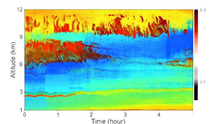 2018年3月24号0:00~5:00我们的测量团队使用多模激光雷达系统对云层进行了5小时的 连续观测,观测数据见图1。底层的强烈信号是边界层内气溶胶颗粒的散射信号,