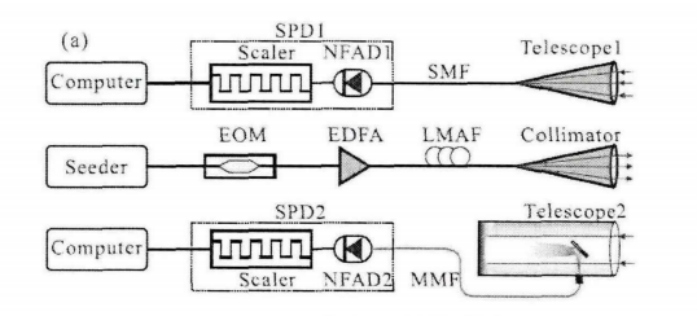 为对比两种耦合方式最终探测效果的差异,我们使用同一个微脉冲发射装置,为单模耦合和多模耦合的InGaAs SPD搭建了不同的接收系统,如图3所示。脉冲 发射装置与前面所述相同,出射激光脉冲重复频率10 kHz, 脉冲能量30 μJ, 脉冲宽度100 ns, 光束发散角约40μrad。单模NFAD接收望远镜直径70 mm, 视场角50 μrad, 多模NFAD接收望远镜直径150 mm, 视场角80μrad。