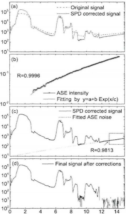 图5 数据处理过程:(a)原始信号与探测器修正信号;(b)ASE 噪声拟合;(c)ASE 噪声修正;(d) 经探测器修正和ASE修正后的最终信号