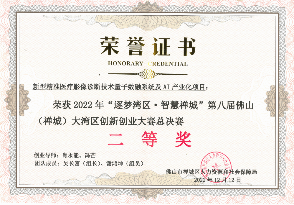 今年年初研发的《新型精准医学影像AI量子数融医疗诊断系统及其产业化》又一次荣获粤港澳亚军.
