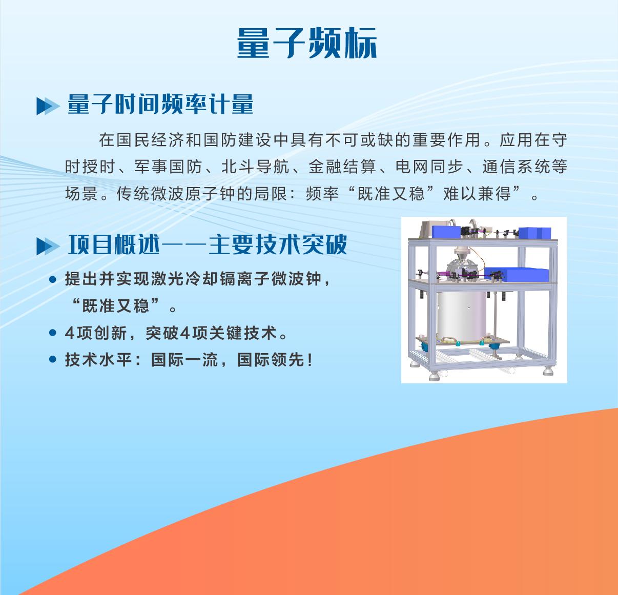 量子测量 量子频标 量子时间频率计量 在国民经济和国防建设中具有不可或缺的重要作用。应用在守时授时、军事国防、北斗导航、金融结算、电网同步、通信系统等场景。传统微波原子钟的局限:频率”既准又稳”难以兼得。 项目概述——主要技术突破 提出并实现激光冷却镉离子微波钟,”既准又稳”。 4项创新,突破4项关键技术。 技术水平:国际一流,国际领先!