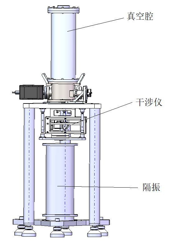 重力仪机械部分由三大部分组成,真空腔、干涉仪、隔振。其中真空腔与隔振固接在一起,隔振采用超级弹簧。真空腔干涉仪通过可调三腿支架直接落地安装,隔振座在可调支架上直接安装在地面。